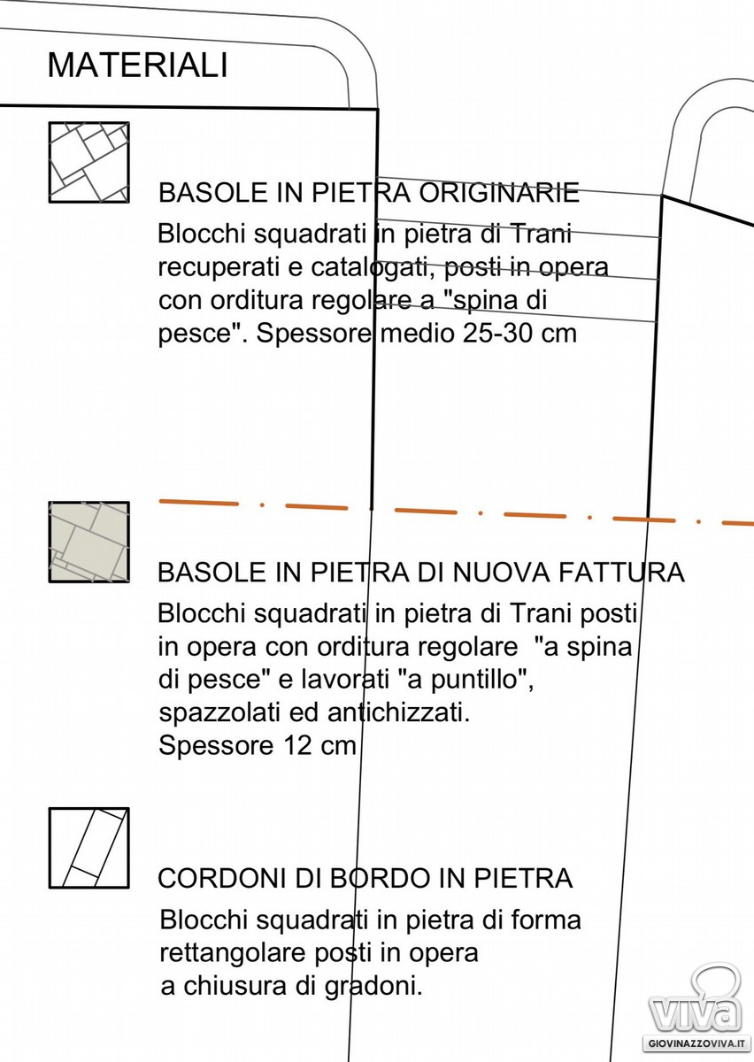 "Per quanto riguarda i basolati da rimuovere, questi dovranno essere numerati e ricollocati secondo la TESSITURA, (come appena indicato il disegno) originaria, riducendo al minimo le perdite di materiale storicizzato. Il trattamento delle superfici delle nuove basole per le integrazioni deve essere concordato con la Soprintendenza ABAP competente mediante campionature, prevedendo una lavorazione a bocciarda eseguita a mano con punta grossa."