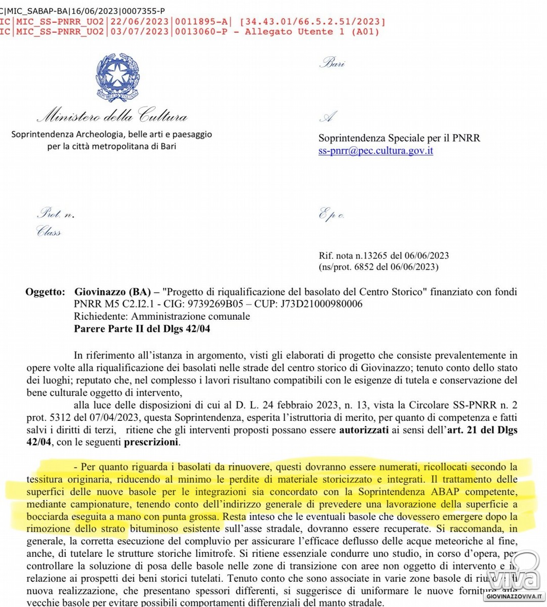 «In questi giorni si assiste a ricostruzioni fantasiose circa l'esecuzione dei lavori di manutenzione del secondo lotto del tessuto viario nel centro storico. A tal proposito, è opportuno evidenziare che ogni scelta relativa all'opera ed al posizionamento della pietra bocciardata è stata prescritta dalla Soprintendenza di Bari, unico e insindacabile organo competente di controllo preposto alla tutela dei beni di interesse storico.