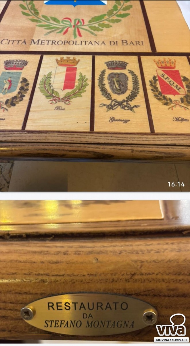 «Nel 1957 infatti - spiega il presidente dell'Associazione "Quelli dell'IVE" di Giovinazzo, Saverio Nenna - furono proprio gli "spizziotti", ovvero i ragazzi ospiti dell'Istituto Vittorio Emanuele II di Giovinazzo che nel laboratorio d'arte e mestieri esistente nell'interno dell'Istituto, a realizzare, sotto la guida del maestro Donato Maldari, gli scranni e gli altri arredi dell'allora Consiglio Provinciale, raggiungendo livelli in cui l'ebanisteria di qualità sfiorava l'opera d'arte. Oggi la memoria dell'IVE e dei suoi "ragazzi", peraltro dal 2023 cittadini onorari di Giovinazzo, è tenuta viva dall'Associazione "Quelli dell'IVE", che nell'occasione del FAI d'Autunno ci ricorda che proprio uno di loro, il compianto Stefano Montagna, dapprima "ragazzo" ospite e poi dipendente della Città Metropolitana, qualche anno fa restaurò con eccellente perizia il tavolo che riporta gli stemmi di tutti i Comuni afferenti alla ex provincia barese».