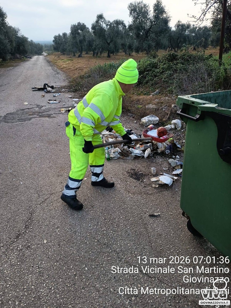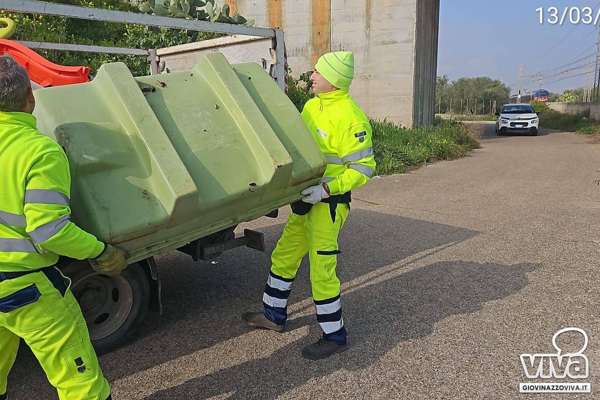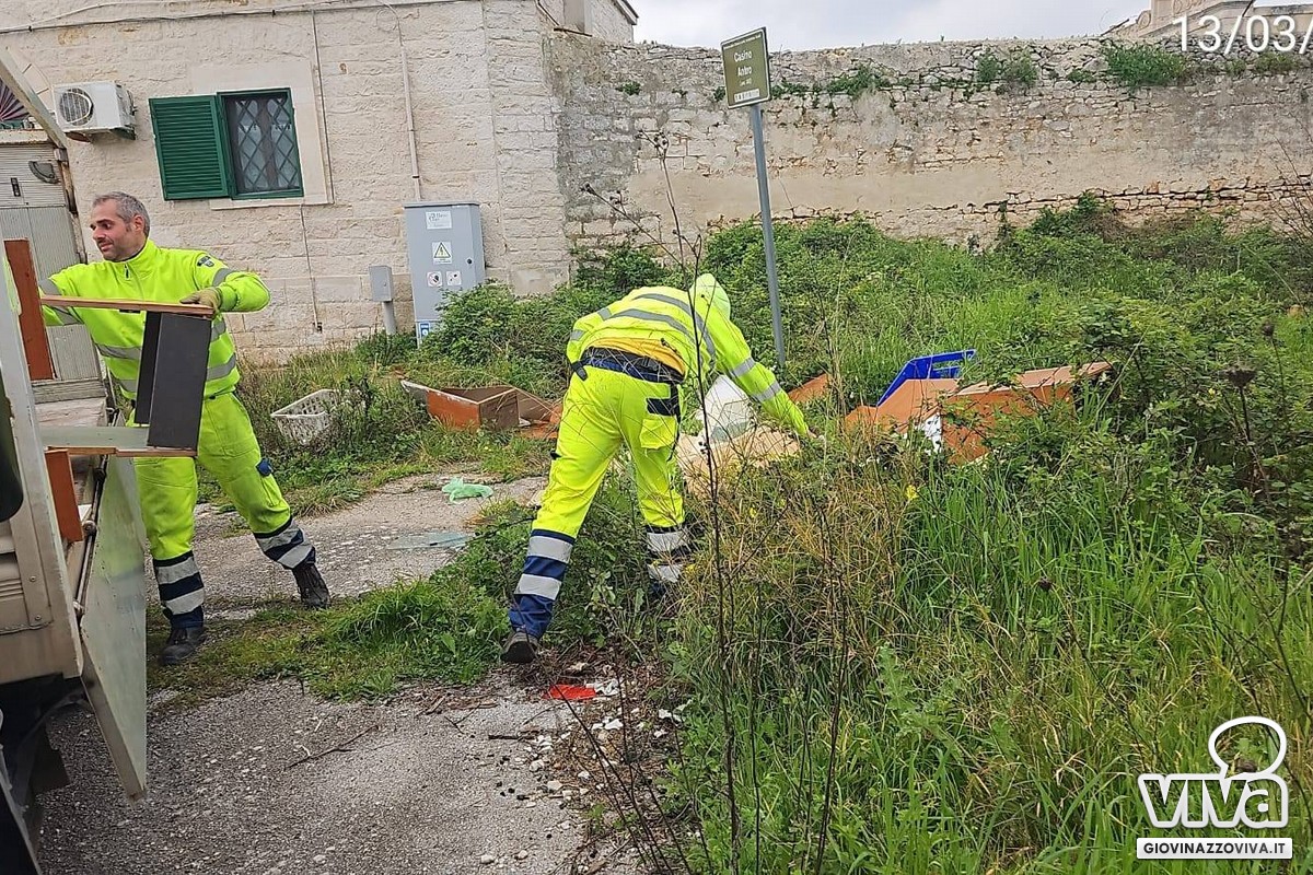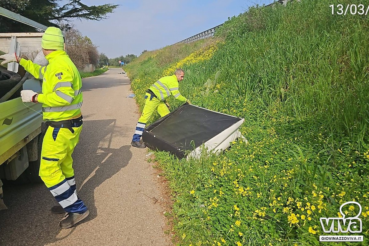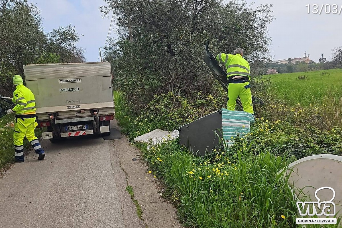 Nella giornata di ieri, venerdì 13 marzo, l'amministrazione comunale ha provveduto ad effettuare un nuovo capillare intervento di pulizia dell'agro giovinazzese. Operatori Impregico all'opera per una pulizia straordinaria (la quarta dallo scorso autunno) che questa volta ha riguardato le zone rurali in Contrada San Martino, Contrada Sant'Antonio ed infine lungo a complanare in località Pozzo Rosso, verso Santo Spirito, tra quelle più funestate dall'abbandono indiscriminato di rifiuti.