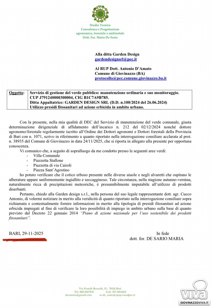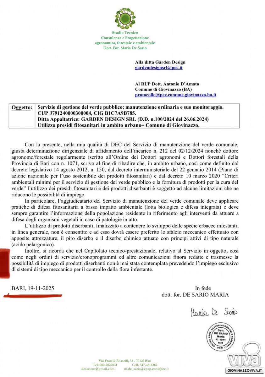 «L'utilizzo di diserbanti non autorizzati dal Ministero dell'Ambiente in ambito urbano è assolutamente vietato o limitato in alcuni casi specifici; tale divieto è chiaramente e ovviamente specificato ed espresso nel Capitolato Tecnico Prestazionale per la manutenzione del verde della nostra città.Per quanto attiene il presunto utilizzo di prodotti diserbanti vietati l'amministrazione, aveva già sollecitato il Direttore dell'Esecuzione del Contratto (DEC), un agronomo, ad inviare una nota formale (PEC) all'impresa di gestione del verde, avvenuto in data (19/11/2025), ben prima che PVA depositasse l'interrogazione del (21/11/2025) poi discussa in Consiglio Comunale. La nota indicata del (19/11/2025) veniva ulteriormente ribadita in data (29/11/2025). L'impresa di manutenzione, a seguito delle due note (19/11 e del 29/11/2025) ha risposto ufficialmente, in data (10/12/2026), indicando, che i prodotti utilizzati rispettavano le prescrizioni ministeriali, dettagliando gli stessi ed evidenziando come questi rientrassero tra quelli consentiti.